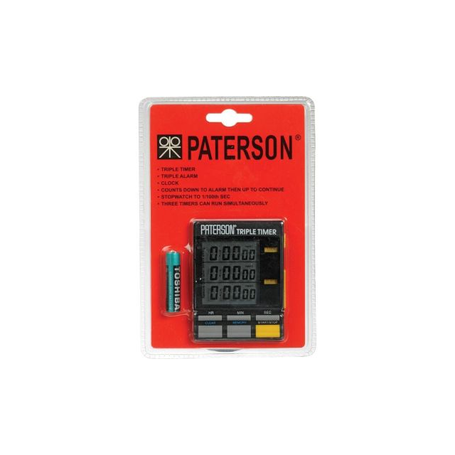 PATERSON DIGITAL TRIPLE CLOCK TIMER. Inexpensive, battery operated hand timer for printmaking exposure times or darkroom use with three different audible tones to control three different functions that can be operated individually or together, LCD readout - supplied complete with battery |