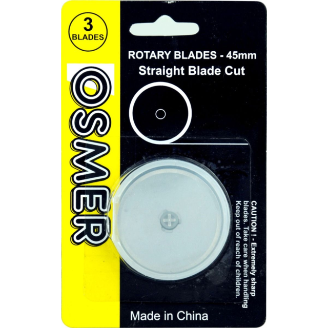 ROTARY WHEEL CUTTER BLADE STRAIGHT 45mm CARD OF 3Suits Osmer rotary wheel cutter. 3 Blades per hangsell pack - 45 mm diameter.