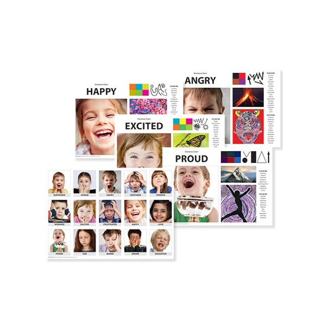 *EMOTIONS ART & LANGUAGE CHART PACK A3 PACK 10. A valuable tool designed to assist in the development of emotional literacy: understanding oneself and others. Each of the 10 charts focuses on an emotion which is shown on a child's face: surprised, sad, happy, frustrated, love, proud, disgust, excited, afraid and angry. The emotion is then explored through language, how it may be depicted in the environment and expressed thru art. |