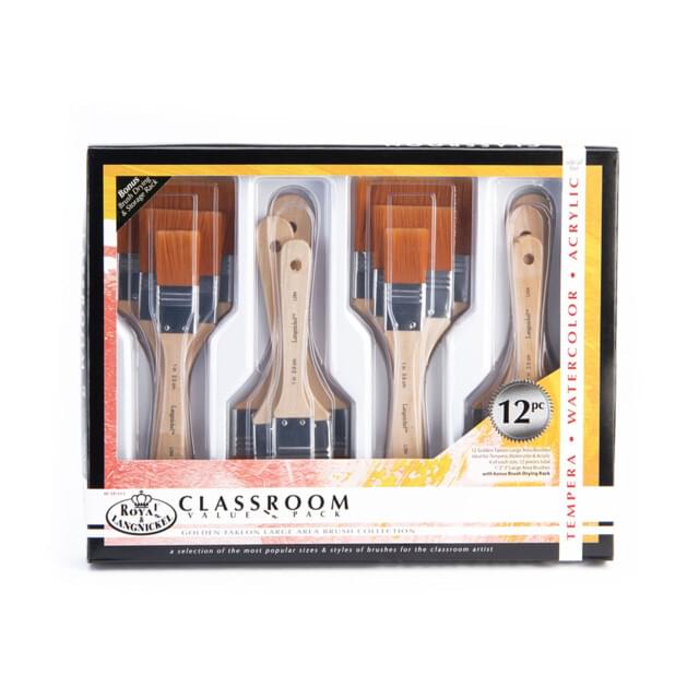 R&L LARGE AREA GOLDEN TAKLON 12 BRUSH SET. Ideal for classroom use, this 12 piece golden taklon, wooden handled brush set contains 4 brushes each of the large flat sizes 1, 2 and 3 inch (25, 50 and 75mm). |