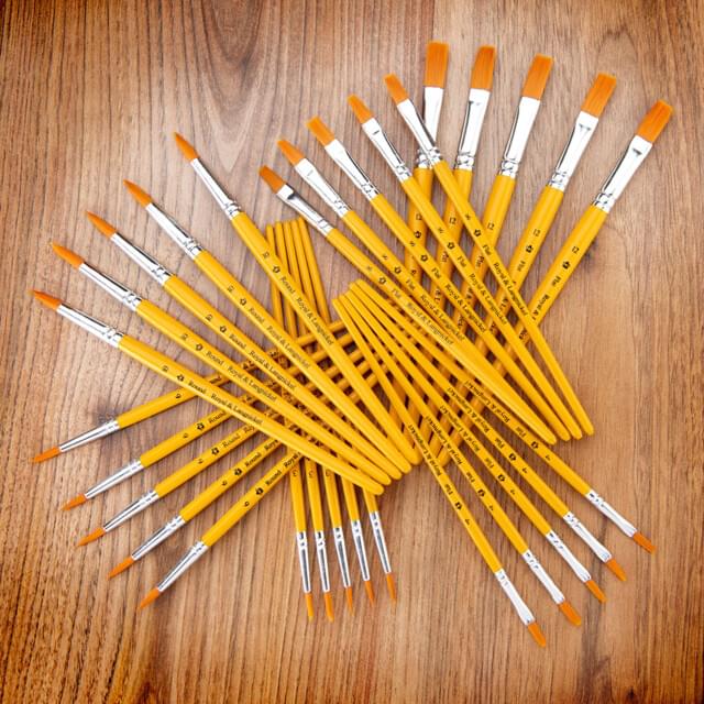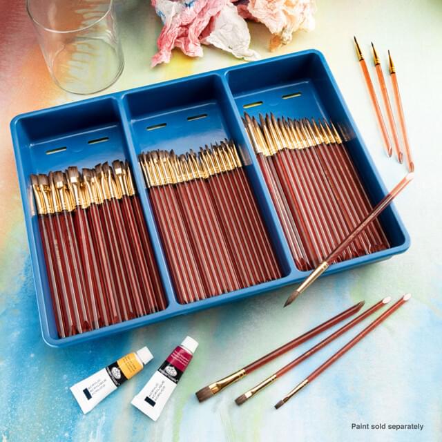 R&L FLAT GOLDEN TAKLON BRUSH CLASSROOM SET 30. Ideal for classroom use, this 30 piece golden taklon, wooden handled brush set contains 5 brushes each of the 6 popular flat sizes 2, 4, 6, 8, 10 12. Packed in a re-usable white plastic drying and storage box. |