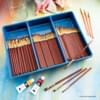 R&L 15 ROUND+15 FLAT GOLDEN TAKLON CLASSROOM BRUSH SET. Ideal for classroom use, this 30 piece golden taklon, wooden handled brush set contains 5 brushes each of the round sizes 3, 6 &10 plus 5 each of flat sizes 4, 8 & 12 packed in a re-usable white plastic classroom drying and storage box. |
