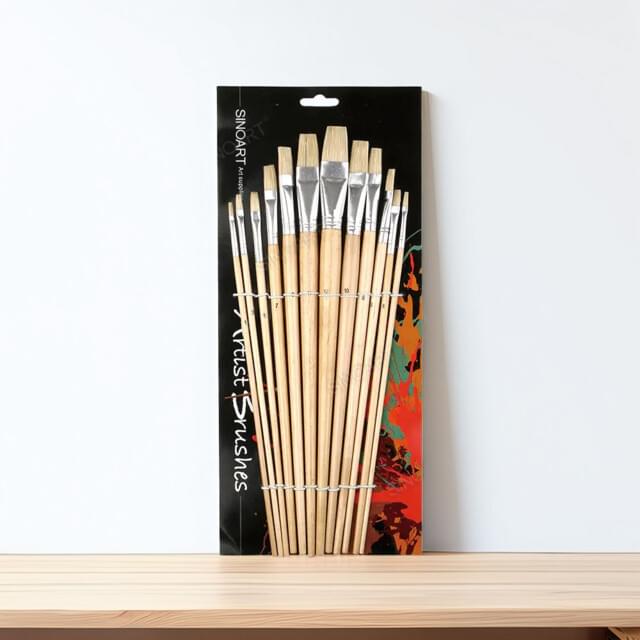 SINOART LONG HANDLE FLAT HOG BRISTLE BRUSH SET OF 12.