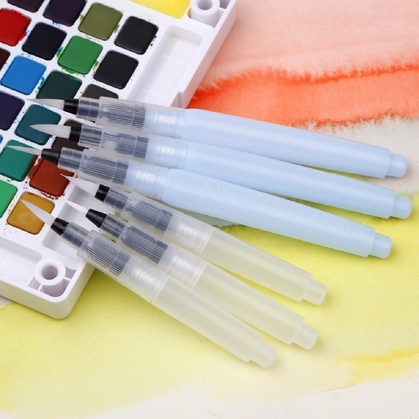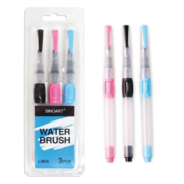 SINOART REFILLABLE WATER TANK PUMP BRUSH SET 3. These brushes take the refillable water-brush concept to the next level with a large capacity water tank featuring a unique press button re-wetting action. This colour-coded synthetic fibre brush set contains one brush each of fine, medium and broad to suit all water-based media painting requirements. |