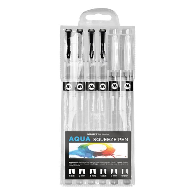 MOLOTOW 6 AQUA SQUEEZE BRUSH PEN SET #2. Refillable with alcohol-based or highly fluid inks for easy colouring, Contains one Aqua Squeeze brush pen each in 1mm, 2mm & 3mm round plus 4mm, 7mm & 10mm flat chisel. |