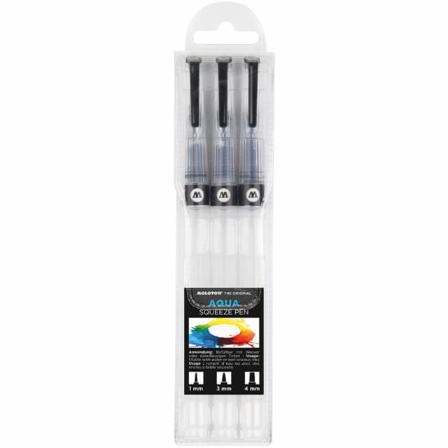 MOLOTOW 3 AQUA SQUEEZE BRUSH PEN SET 1. Refillable with alcohol-based or highly fluid inks for easy colouring, Contains one Aqua Squeeze brush pen each in 1mm & 3mm round plus 4mm flat chisel. |