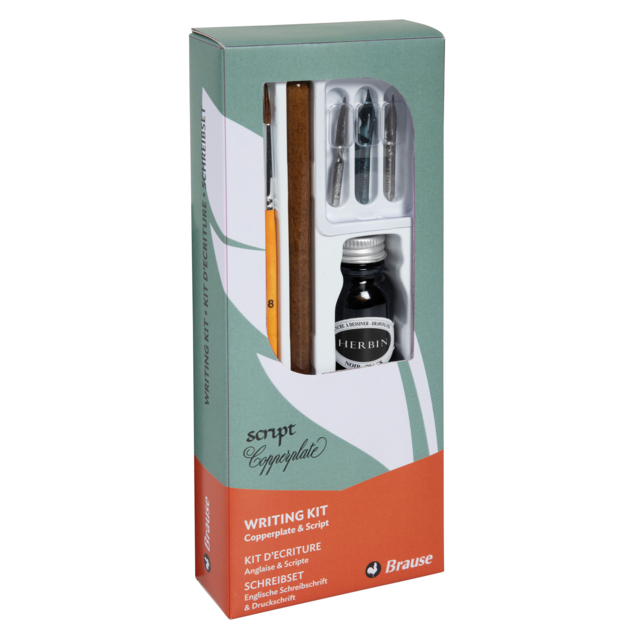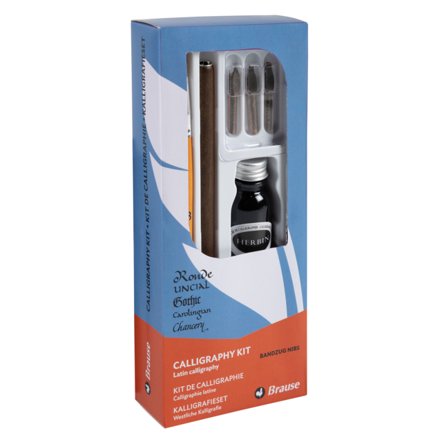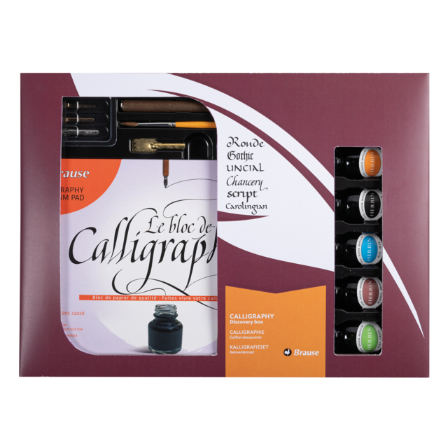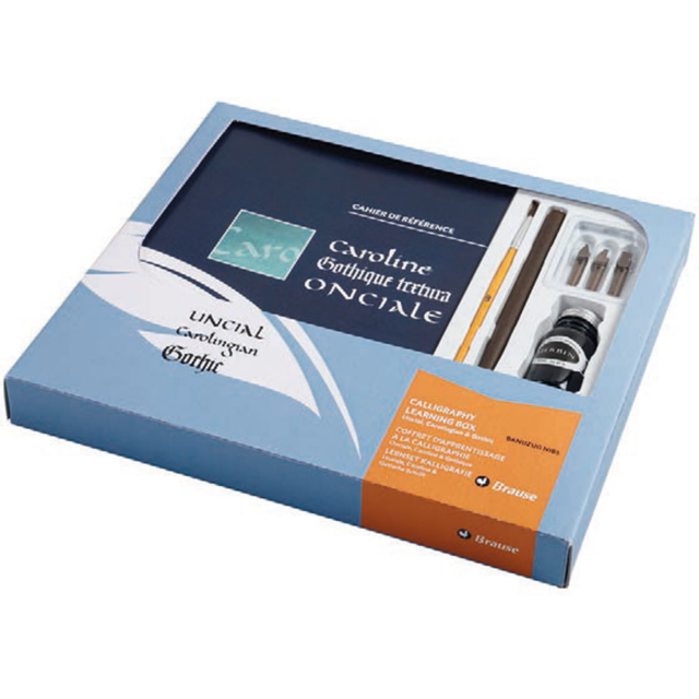 B0000133 B0000133 BRAUSE INTRODUCTION TO CALLIGRAPHY BOX. Beautifully presented box with everything needed to begin calligraphy. Contains a wooden nib holder, 3 square metallic calligraphy nibs - 15B (1.5mm), 25B (2,5mm), and 50B (mm) plus, calligraphy brush, one 15ml Herbin Black ink and 24 page practice book containing 6 pages each of 4 calligraphy styles to practice. Available soon Login For Price