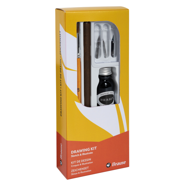B0000145 B0000145 BRAUSE NIB HOLDER/NIBS/INK DRAWING BOXED SET. Beautifully presented set containing a wooden nib holder, 3 metallic drawing nibs - 66B extra fine point (0.3mm), 511B medium soft, and 513B hard fine point plus one 15ml Herbin Black ink and instruction booklet. In stock Login For Price