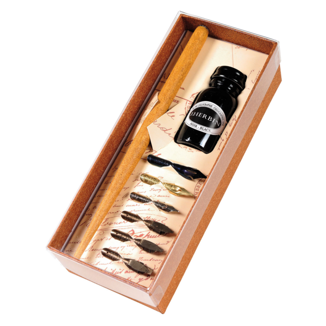 B0000149 B0000149 BRAUSE COMPLETE CALLIGRAPHY GIFT BOX SET. The ideal gift for anyone who is into calligraphy. Contains a wooden nib holder, 2 Bandzug calligraphy nibs - 15B (1.5mm), 25B (2,5mm), 2 writing nibs - 76B (0.45mm) pan, 10B (10mm) plakat plus, calligraphy brush, one 15ml bottle each of Herbin ink in Black, Orange, Green, Blue and Brown and pack of 10 (25 x32cm) calligraphy practice cards featuring 9 classic lettering styles. In stock Login For Price