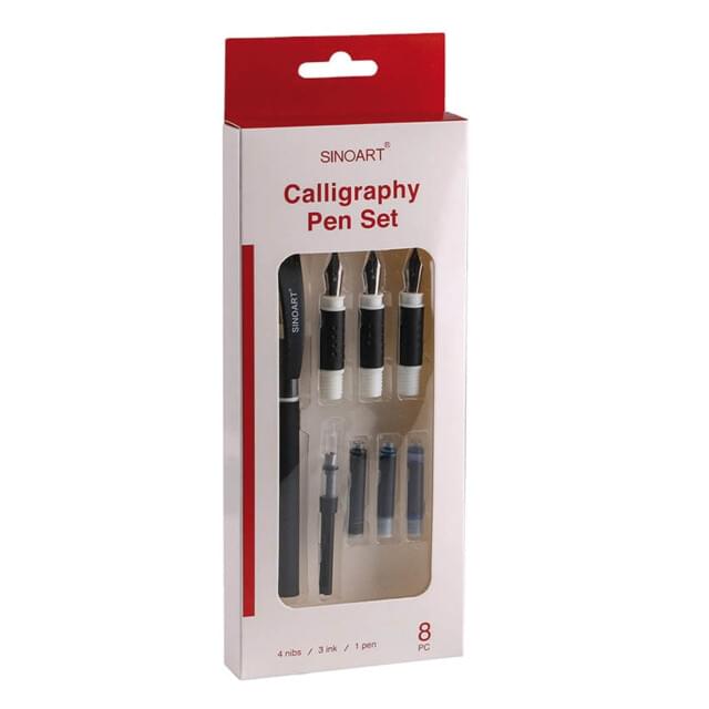 SINOART CALLIGRAPHY CARTRIDGE 9 PIECE PEN SET. Contains a pen barrel with cap, re-fillable ink tank, stainless steel nibs in extra-fine, fine, medium and bold plus one ink cartridge each in black, blue and blue/black |