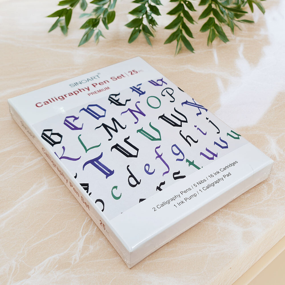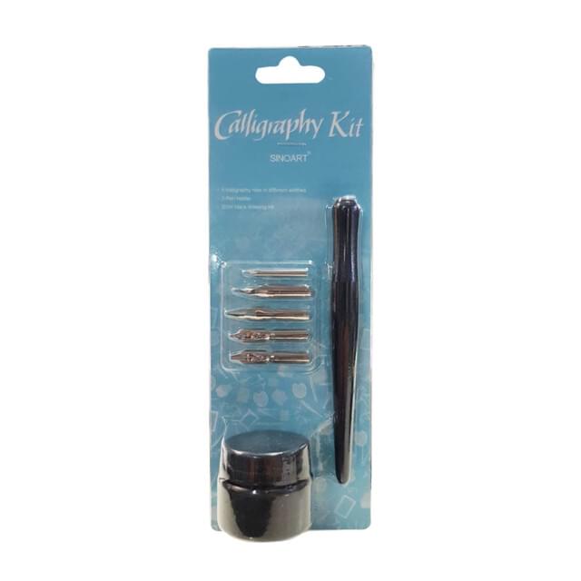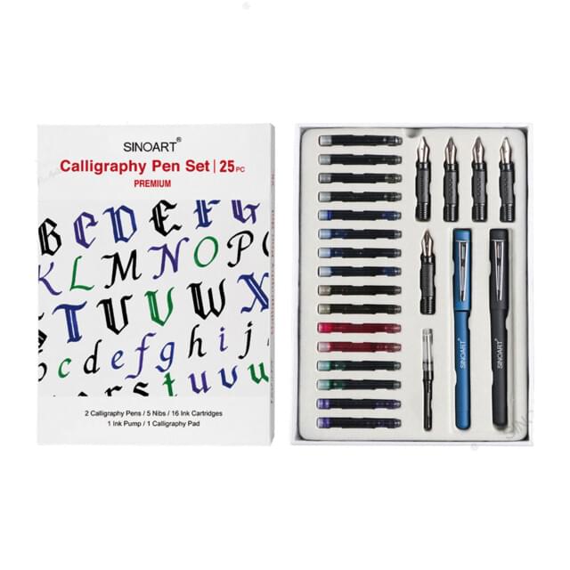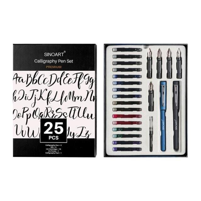 SINOART FINE ARTS 25 PIECE CALLIGRAPHY GIFT BOX SET.A comprehensive calligraphy set containing 2 cartridge pen barrels with caps, 5 assorted style screw-in pen points, 16 ink cartridges (4 black, 4 blue plus 2 each red, green, purple and brown, a refillable ink pump plus an A4 calligraphy practice pad. |