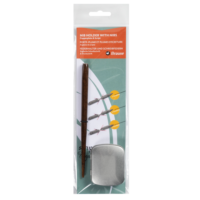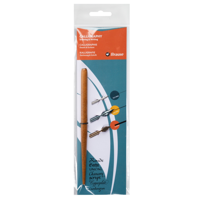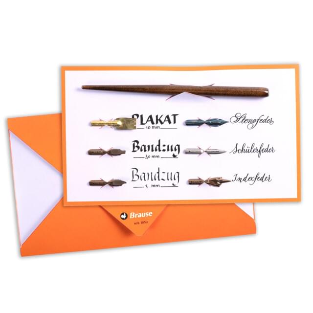 BRAUSE NIB HOLDER+6 NIB CALLIGRAPHY SET CARD No.2. Calligraphy & writing set no.2. Contains 1 wooden nib holder and 6 nibs (St no, Ecoliere, Index, Plakat 10mm plus Bandzug : 1,5/3mm). |
