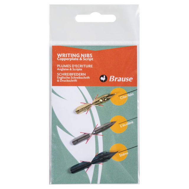 BRAUSE 3 ASSORTED WRITING NIBS CARD SET #1. Contains one each of the L'Ecoliere (65B), Cito Fein (46B) and Steno (361B) nibs |