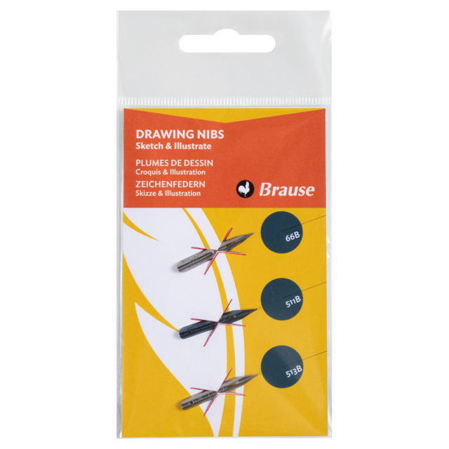 BRAUSE 3 ASSORTED DRAWING NIBS CARD SET. Contains one each of the Extra Fine Point (66B), Medium Soft (511B) and Hard (513B) nibs |