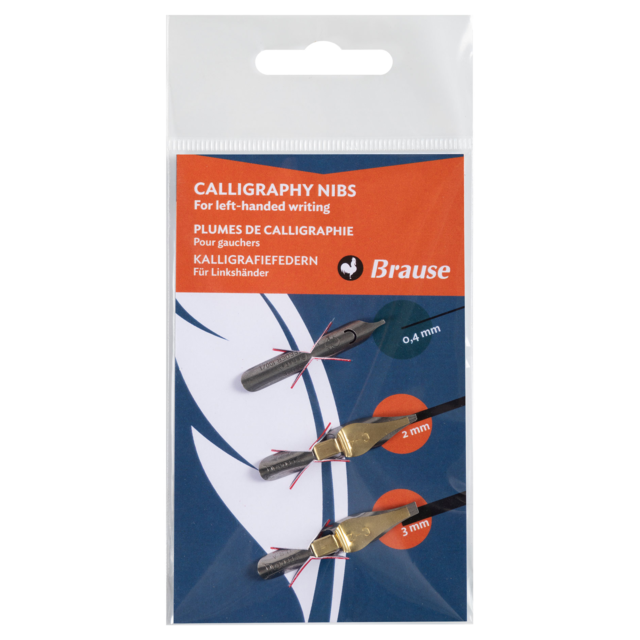 BRAUSE 3 ASSORTED CALLIGRAPHY NIBS CARD SET #3. Left handed set containing one each of the Speedball 2.0mm, 3.0 and Hatat nibs. |