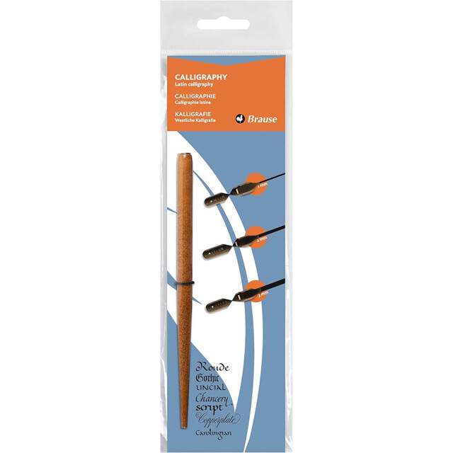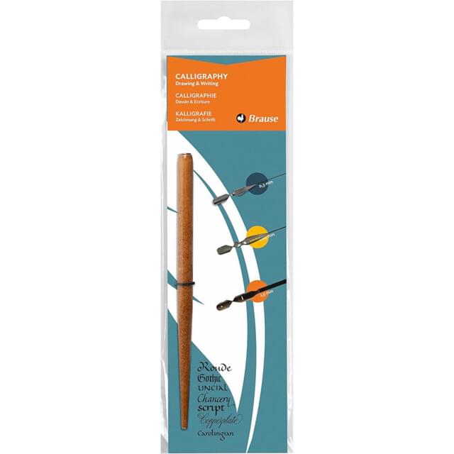 BRAUSE NIB HOLDER & 3 NIB CALLIGRAPHY SET. Contains wooden nib holder and one each of the Extra Fine Point (66B), Steno (361B) and 2mm Bandzug nibs |