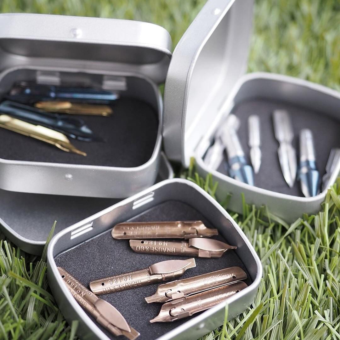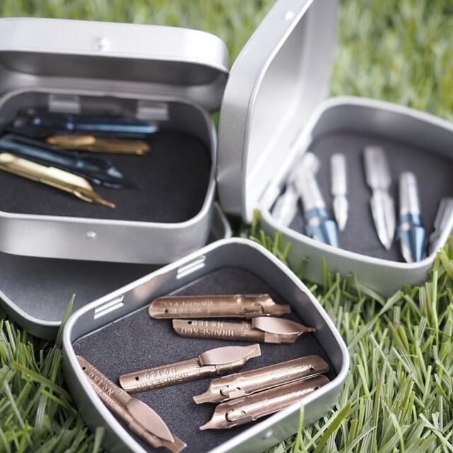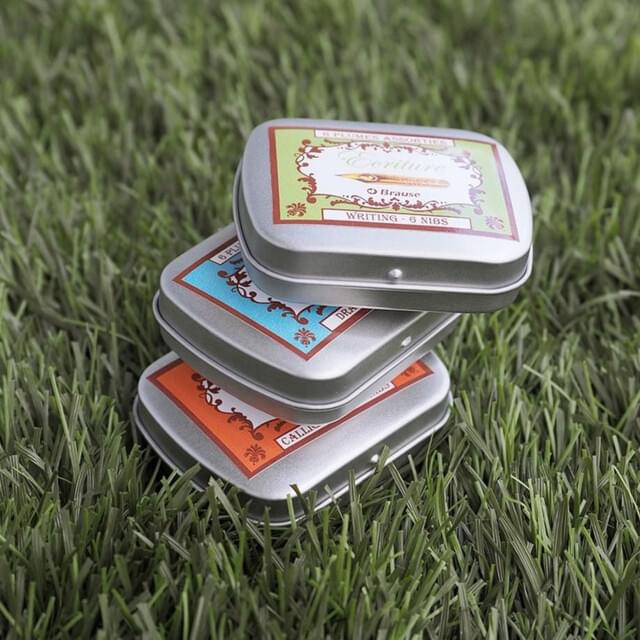 BRAUSE METAL BOX 6 NIB CALLIGRAPHY ASSORTMENT. This stylish metal box contains 2 each of the 3 most popular calligraphy style nibs including: Bandzug 0.7, 2.0 and 3.0mm. |