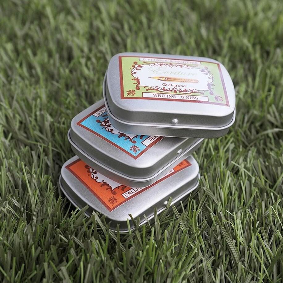 BRAUSE METAL BOX 6 NIB DRAWING ASSORTMENT. This stylish metal box contains 2 each of the 3 most popular drawing style nibs including: L'Ecoliere 65B,Extra Fine 66B and 5mm Ornamental 50050B. |