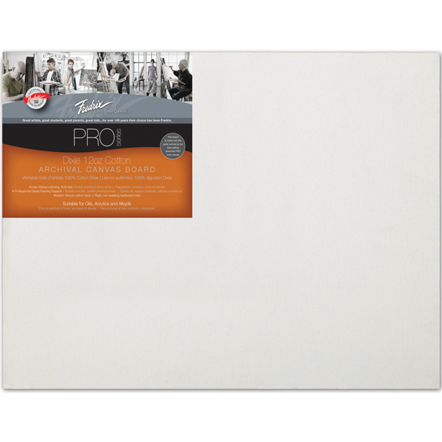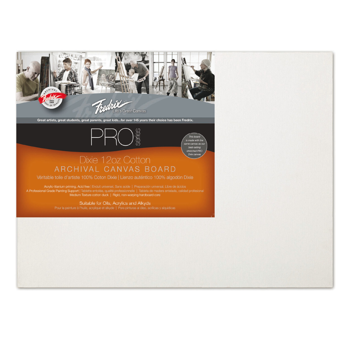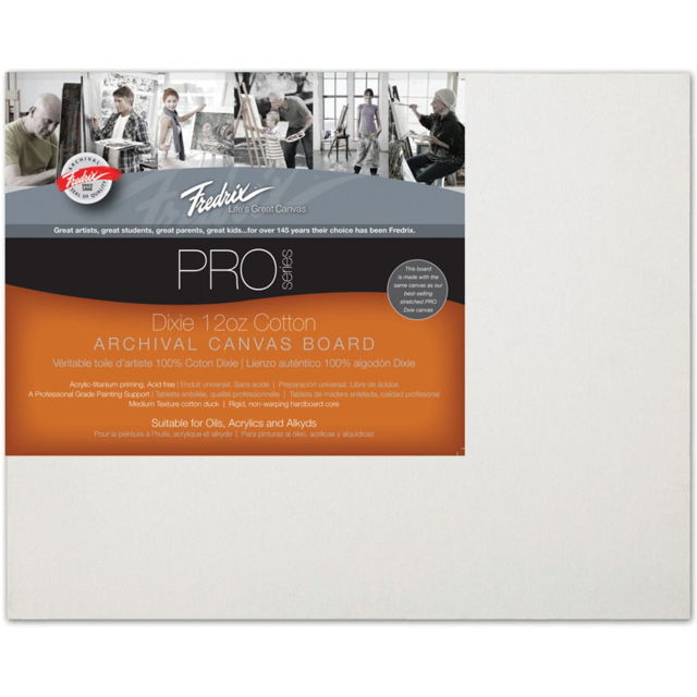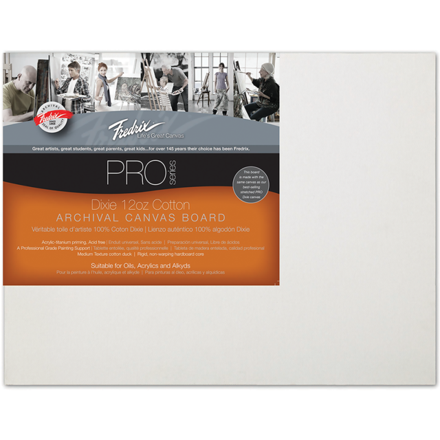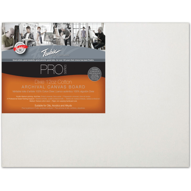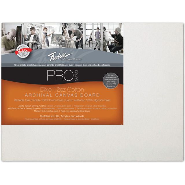 Fredrix Archival Cotton Canvas Board is a professional grade, archival painting surface featuring medium texture, white primed, heavyweight (593gsm) canvas mounted on an acid-free MDF board for professional results. The Dixie PRO Series canvas used is double-primed with an acid-free acrylic titanium gesso and mounted with proprietary acid-free adhesive, ensuring they will stand the test of time. . A versatile option for oils, acrylics, water soluble oils, enamels, paint markers, permanent markers, spray paints and alkyds.