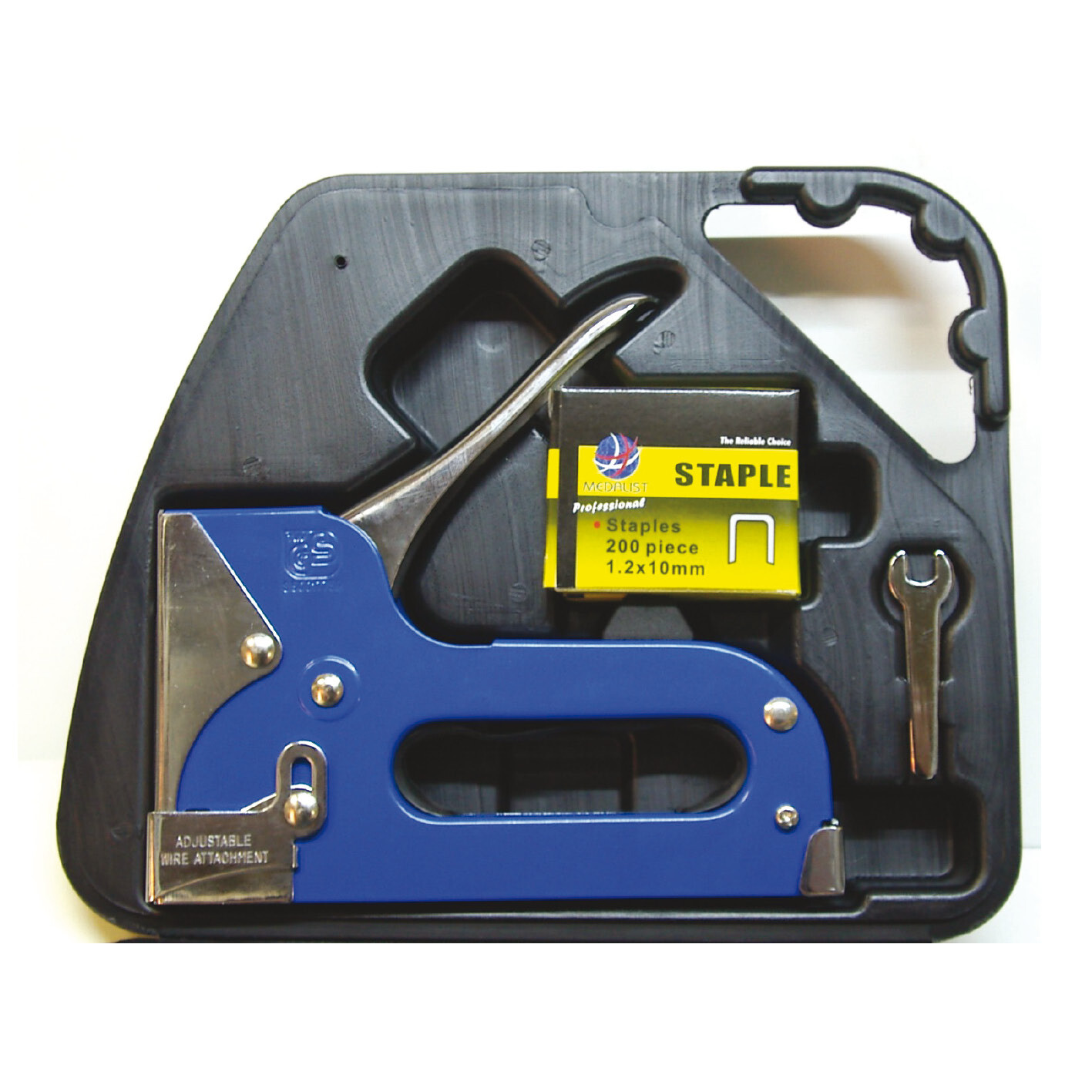STAGMD STAGMD MEDIUM DUTY TRIGGER TACKER/STAPLE GUN KIT. Medium duty, quality chromed metal, staple gun/trigger tacker in a hang sell blister pack with a strip of 8mm staples to get started. Staple (4-8mm) depth penetration adjustable to suit substrate being stapled - easy to load and operate. In stock Login For Price