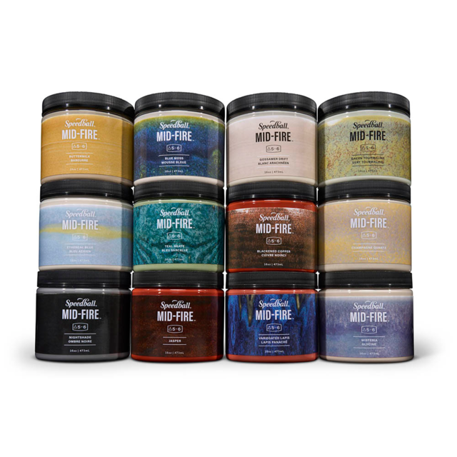 SPEEDBALL MID-FIRE GLAZE 12-COLOR SAMPLER PACK 4oz (118ml) This set includes one each 4oz (118ml) bottle each of Gossamer Drift, Blackened Copper, Green Tourmaline, Teal Agate, Buttermilk, Jasper, Wisteria, Variegated Lapis, Nightshade, Champagne Quartz, Ethereal Blue, Blue Moss. |