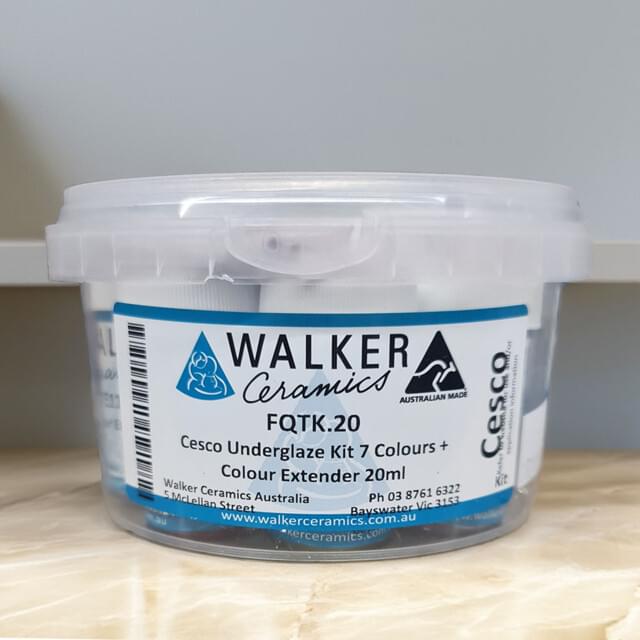 UNDG207EK UNDG207EK CESCO 7x20ml COLOUR PLUS EXTENDER UNDERGLAZE TEST KIT. This underglaze test kit contains one 20ml bottle each of Arctic Blue, White, Victoria Green, Red Brown, Daffodil Yellow, Purple, Bright Red plus Colour Extender. In stock Login For Price