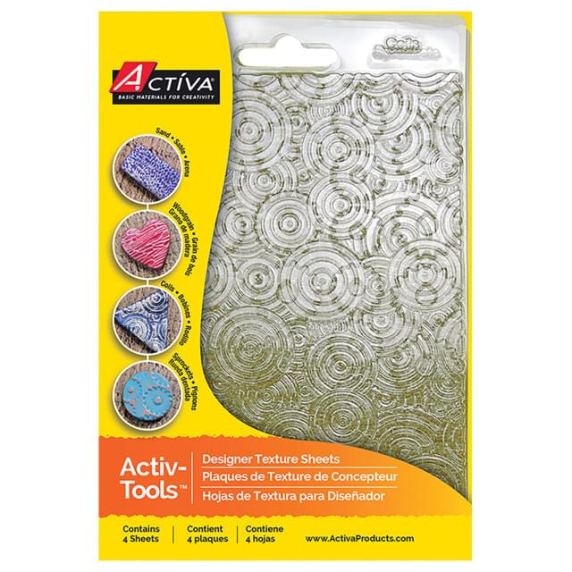 ACTIVA DESIGNER TEXTURE SHEETS SET OF 4. Use to add detail, dimension, and texture to any clay project with Designer Texture Sheets. This set of four clay texture sheets include one sheet each the following designs; Wood grain, Sand, Coils and Sprockets. Simply spread a thin amount of cornstarch to a piece of clay, lay one of the Designer Clay Texture Sheets on top, and gently roll flat to make an impression. |