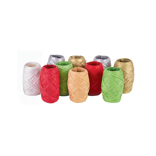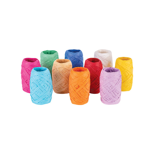 *BASIC COLOURED PAPER RAFFIA PACK 10x10m ROLLS ASSORTED. This 6mm wide paper raffia is produced from a multi-folded 30mm wide paper strip and is great for weaving and many other general crafting activities. The handy colourfast assortment won t stain hands and easily unwinds off the 10 metre rolls of 10 assorted colours of Kraft/Natural, White, Yellow, Green, Orange, Light Blue, Red, Dark Blue, Dark Pink and Purple. |