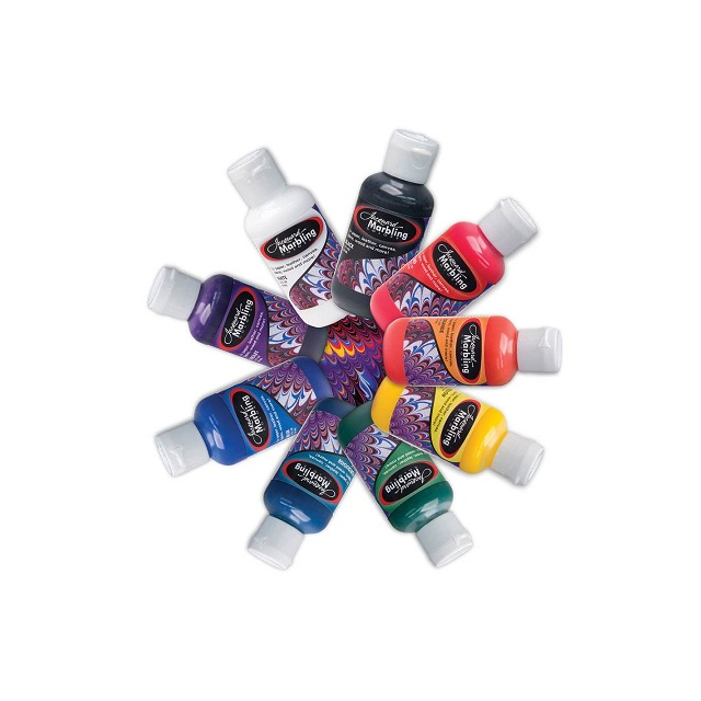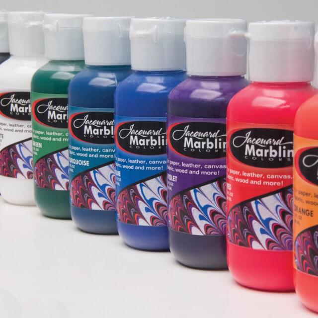 JACQUARD MARBLING KIT Set 6. Suitable for use on paper or fabric. Kit contains one 15ml bottle each in yellow, red, violet, blue, white and black, 15ml synthetic gall, 114gm Alum, 28gm Carrageenan and instructions. |