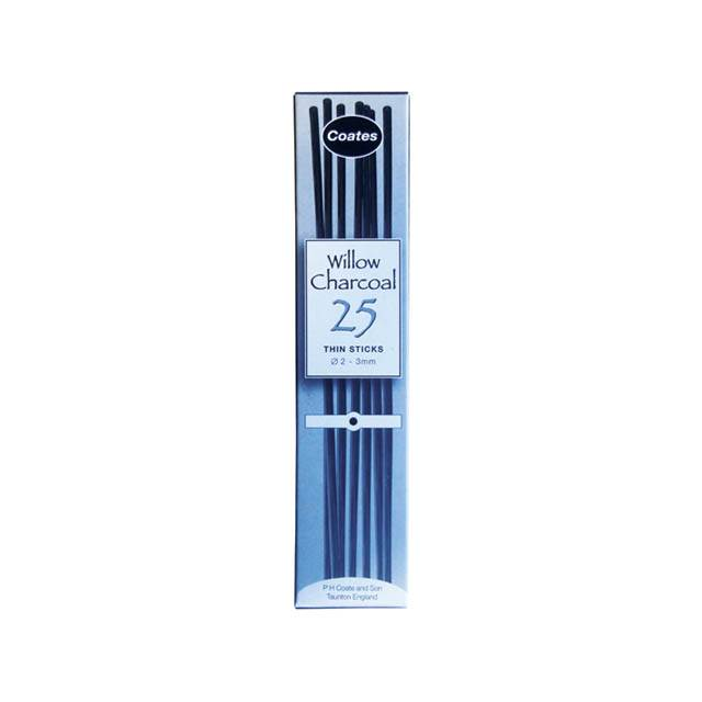 COATES ARTISTS WILLOW CHARCOAL 2-3mm Diameter Box 25. The soft black charcoal produced from these best quality willows is particularly well suited to satisfy the whole range of artistic needs. Full length 135mm long sticks. |