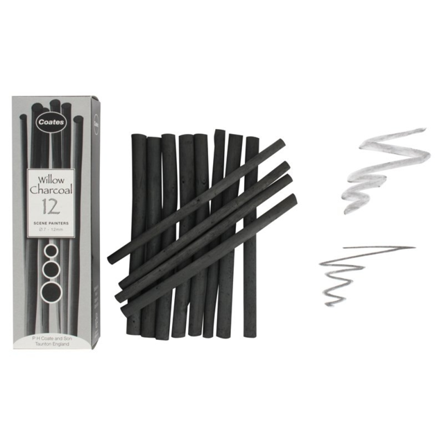 COATES ARTISTS SCENERY PAINTER WILLOW CHARCOAL 7-12mm Box of 12. A mixed box of 12 thick willow charcoal sticks, measuring between 7-12mm in diameter. The soft black charcoal produced from these best quality willows is particularly well suited to satisfy the whole range of artistic needs - 135mm long sticks. |