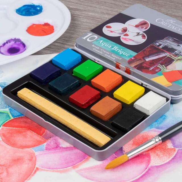 Aqua Brique is a unique painting/drawing tool from Cretacolor. It is a watercolour block which can be used for standard watercolour painting but is versatile enough to use for drawing by hand. Each block measures 22 x 22 x 12mm and is equivalent to approximately 6ml of watercolour paint. The special pigments used provide brilliant colours and exceptional water solubility. It is easily converted into watercolour by adding just a few drops of water. The large block form allows for easy pick-up and use by hand and is big enough for the picking-up of colour with a brush. The Aqua Brique is suitable for a variety of techniques including watercolour painting and drawing, sketching and drawing, sgraffito, blending and frottage. It can be used on a variety of surfaces including paper, canvas, and wood and will also stick to smooth surfaces like glass and plastic. Aqua Brique is exceptionally lightfast even when used as a watercolour and conforms to the three top lightfastness categories.