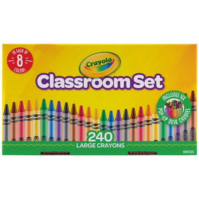 CRAYOLA LARGE CRAYONS CLASSPACK OF 240. Perfect for smaller hands in learning grip and control. The rich colours blend easily and do not smudge. The crayons are paper-wrapped and will not bend from the heat of a users hand. Contains 240 Large Crayons (30 each of 8 popular colours) plus 6 Pop-Up Desk Caddies designed to store and share art tools on tables in the classroom. Just open up the Classroom Set box, remove and pop-up the Desk Caddies, fill them up, place them onto each table and the whole class has all the Large Crayons they need to draw, colour and create. |
