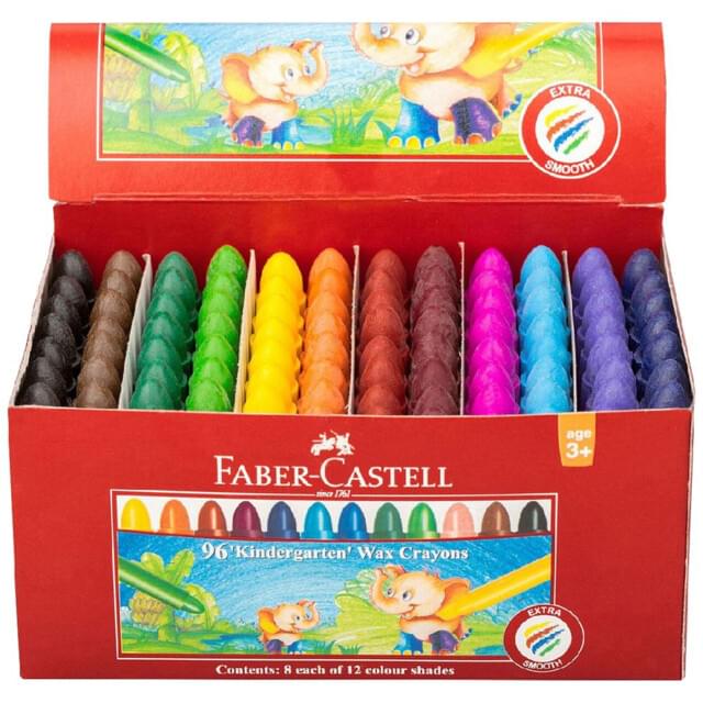 FABER-CASTELL SMALL WAX CRAYONS CLASSBOX OF 96. Contains 8 small (Chubby) crayons each of 12 popular colours. |