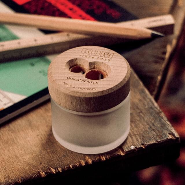 KUM WALDMEISTER (WOODMASTER) MAGNESIUM 2-HOLE PENCIL SHARPENER. Create precise pencil points for both standard and large barrel pencils with the KUM Waldmeister sharpener. Handmade in Germany, this precision sharpener features a dual hole, magnesium sharpener body fitted with quality KUM blades fixed to a crafted Beechwood top plus a fitted glass shavings bowl. |