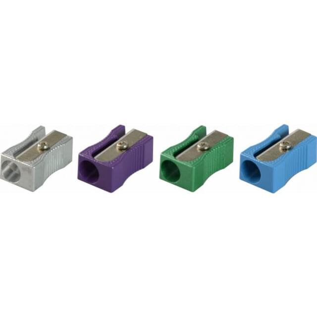 SINGLE HOLE COLOURED METAL BLOCK PENCIL SHARPENER Box24.Contents of 24 easy to hold metal block style sharpeners in 4 assorted anodised aluminium colours. |