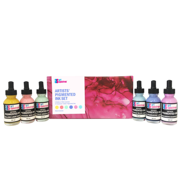 ART SPECTRUM 6x50ml BASIC COLOUR ASSORTED PIGMENT INK SET. This set contains one each of the colours: Yellow, Red, Blue, Green, Sepia and Black. |