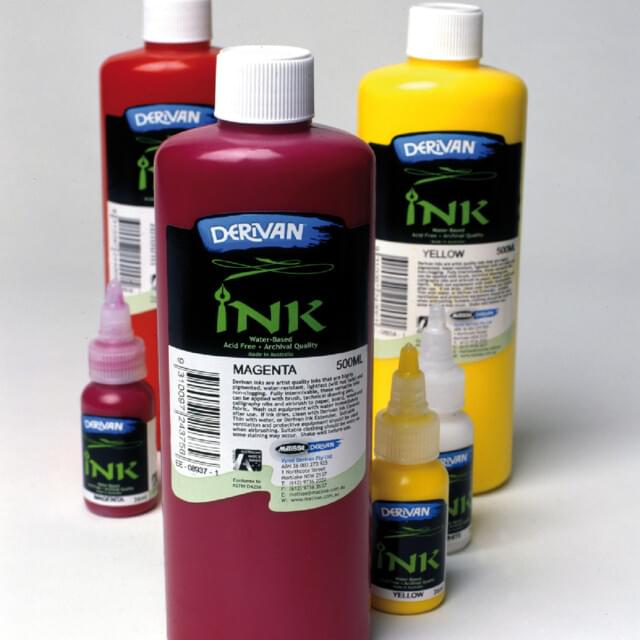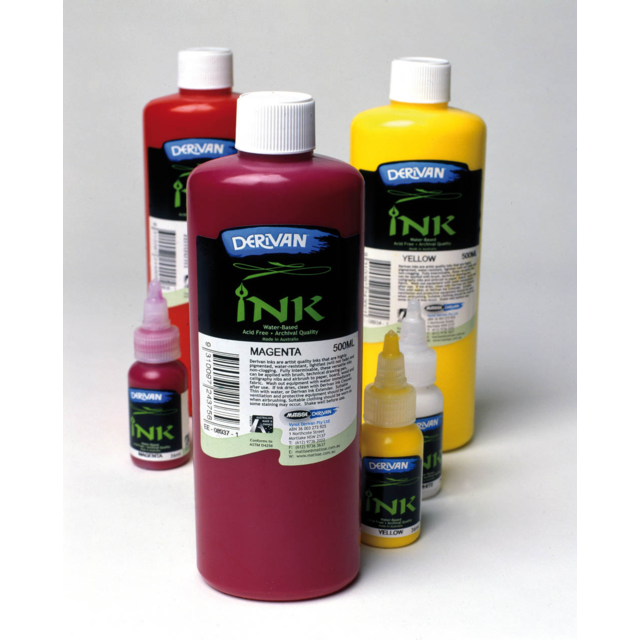 DERIVAN PIGMENTED ACRYLIC ARTISTS INK 500ml - BLACK. Derivan Acrylic Inks are artist quality inks that are highly pigmented, water-resistant, lightfast and non-clogging. Fully intermixable, these acrylic inks can be applied with brush, technical drawing pen, calligraphy nibs and airbrush to paper, board, wood and fabric. |