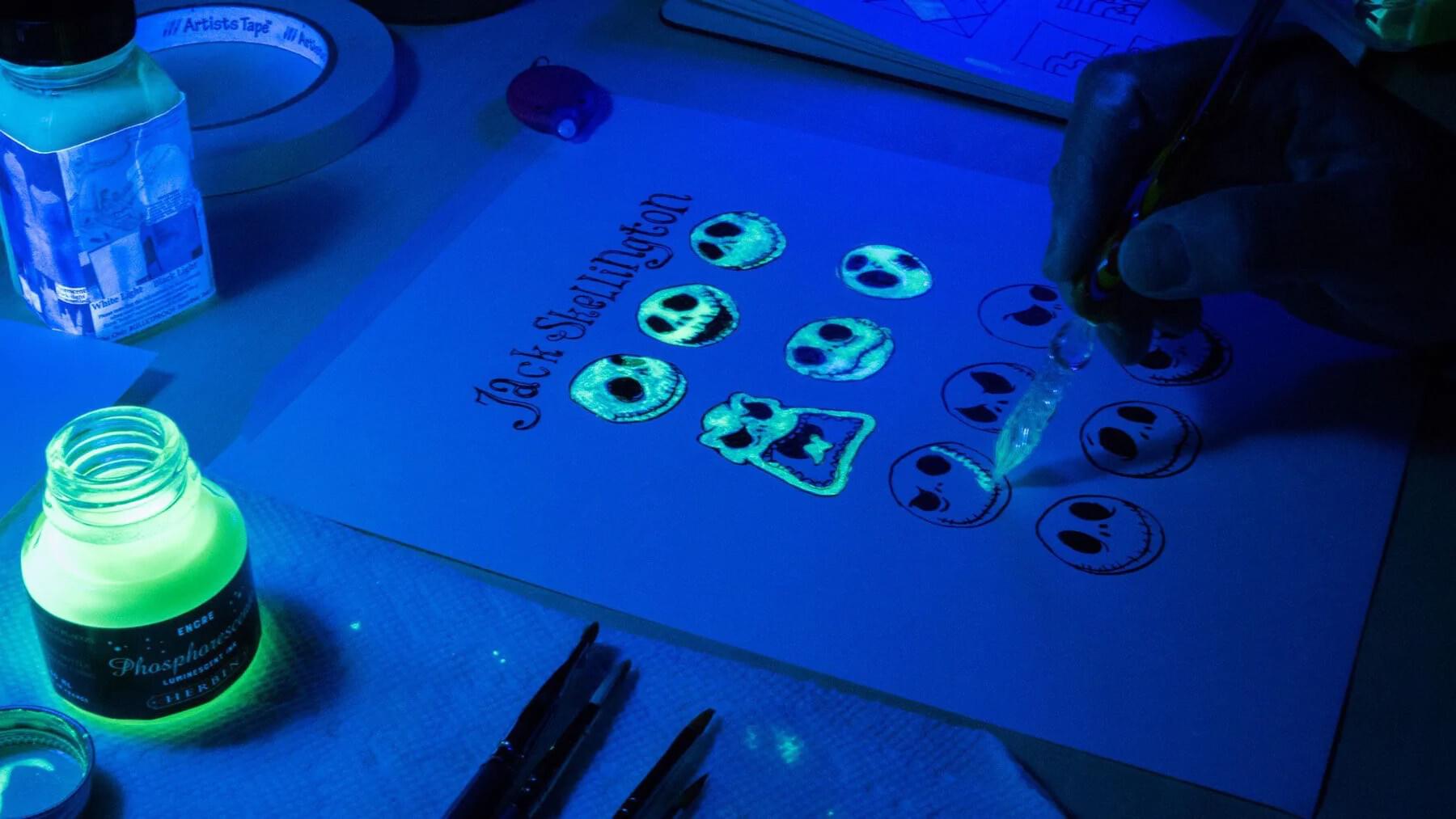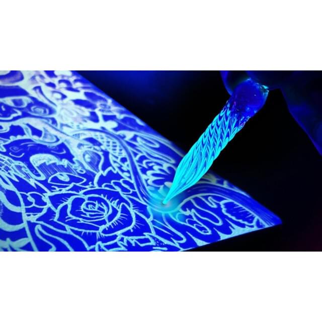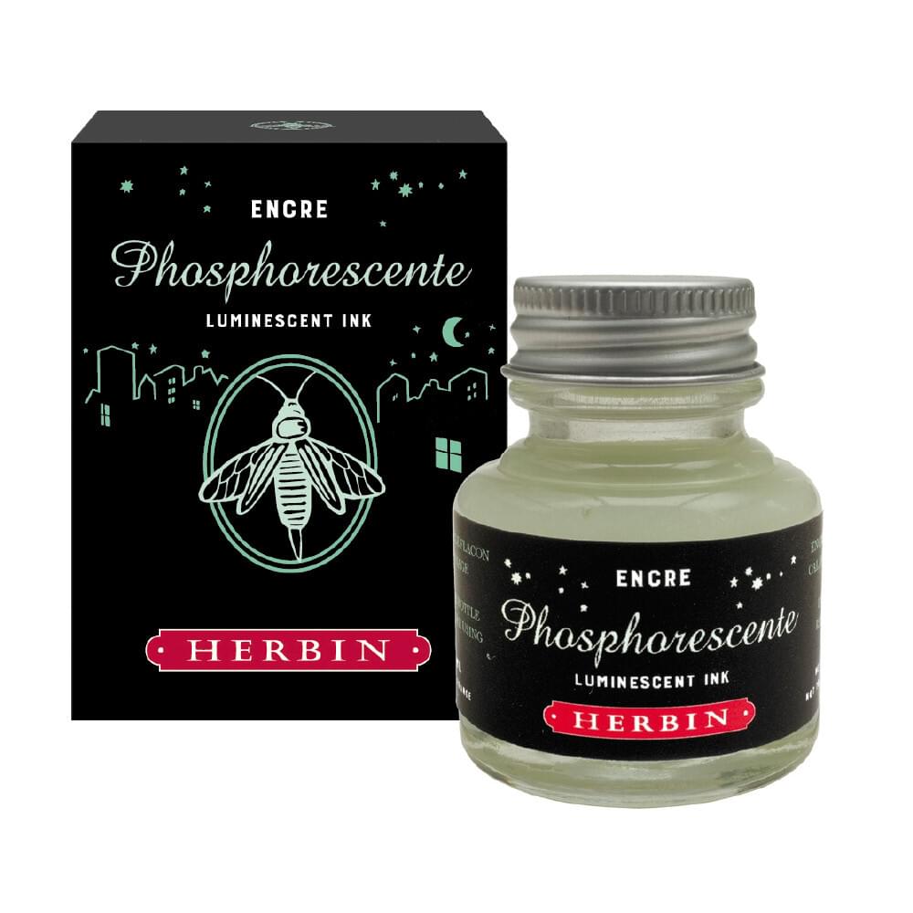 Also known as Luminescent ink, this dip pen ink dries to a translucent finish that is faint on dark paper and nearly invisible on light paper. The ink then glows to phosphorescent green when viewed in the dark or when exposed to UV light. This ink is perfect to hide special messages in calligraphy or the artwork.