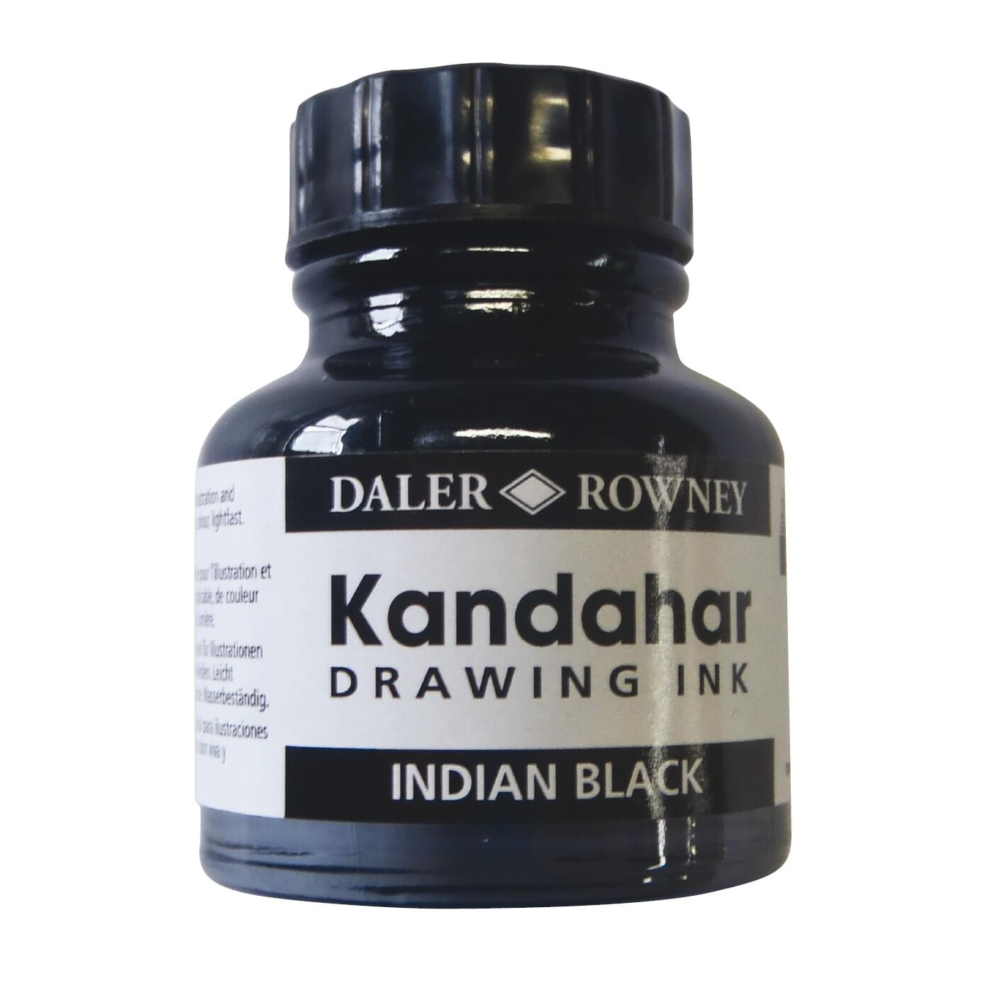 Khandahar ink by Daler-Rowney is a brilliant, light fast, deep black ink that flows easily from pen, brush and airbrush. Khandahar Black drawing ink is ideal for illustration, line drawing, calligraphy and design work. It also works extremely well with all mixed media techniques. Perfect for use on paper, card and board.