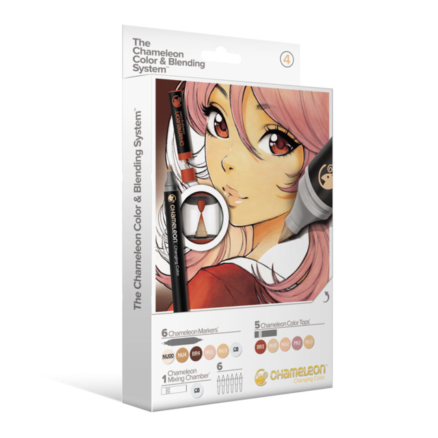 CS6604 CS6604 *CHAMELEON COLOR & BLENDING SYSTEM SET #4. Contains one marker each in nude, caramel, burnt umber, bisque, fawn and colourless blender plus one color top each in cinnamon, sand, light peach, dusty rose and fawn, mixing chamber and 6 brush nibs. In stock Login For Price