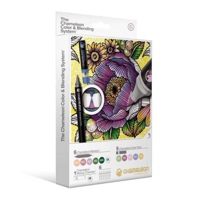 CS6606 CS6606 *CHAMELEON COLOR & BLENDING SYSTEM SET #6. Contains one marker each in light peach, dusty rose, lavender, dark sage, evergreen and colourless blender plus one color top each in green apple, mauve, bubble gum, cornflower blue and mellow yellow, mixing chamber and 6 brush nibs. In stock Login For Price