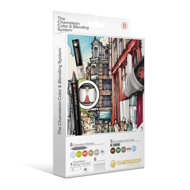 CS6608 CS6608 *CHAMELEON COLOR & BLENDING SYSTEM SET #8. Contains one marker each in baby blue, olive green, vermillion, taupe, warm grey 3 and colourless blender plus one color top each in bark, dark sage, warm grey 7, nude and sky blue, mixing chamber and 6 brush nibs. In stock Login For Price