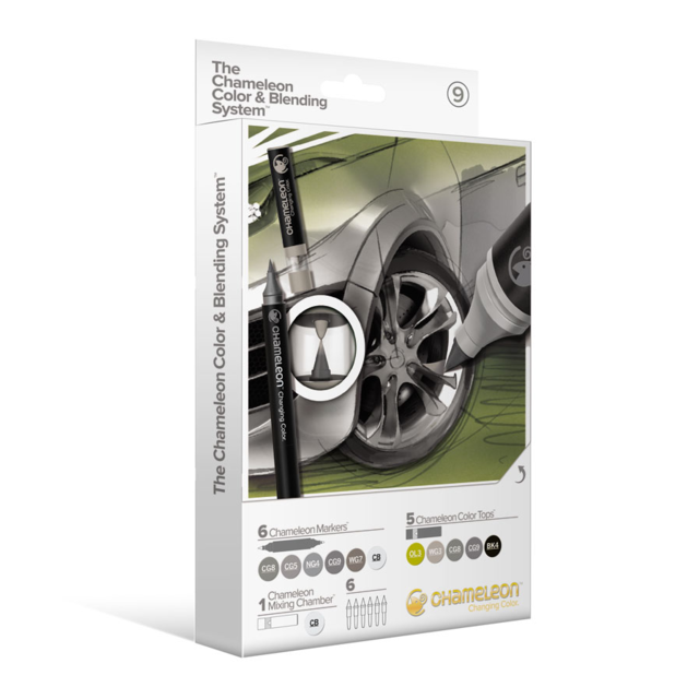 CS6609 CS6609 *CHAMELEON COLOR & BLENDING SYSTEM SET #9. Contains one marker each in cool grey, cool grey 5, neutral grey 4, cool grey 9, warm grey 7 and colourless blender plus one color top each in olive green, warm grey 3, cool grey, cool grey 9 and deep black, mixing chamber and 6 brush nibs. In stock Login For Price