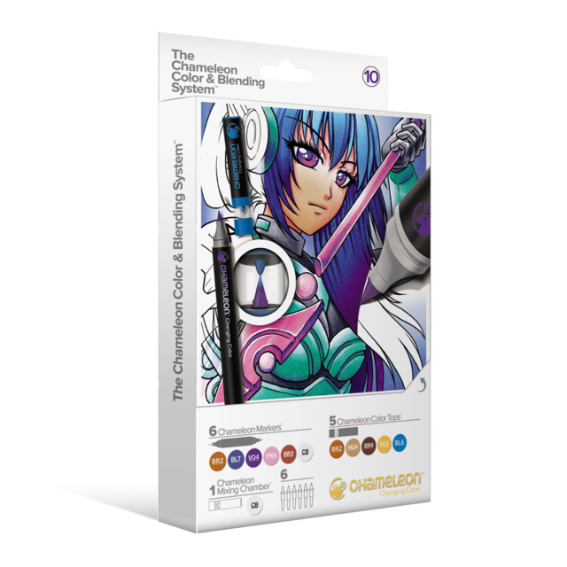 CS6610 CS6610 *CHAMELEON COLOR & BLENDING SYSTEM SET #10. Contains one marker each in hot cocoa, indigo. Deep violet, peony pink, cinnamon and colourless blender plus one color top each in hot cocoa, caramel, burnt umber, warm sunset and royal blue, mixing chamber and 6 brush nibs. In stock Login For Price