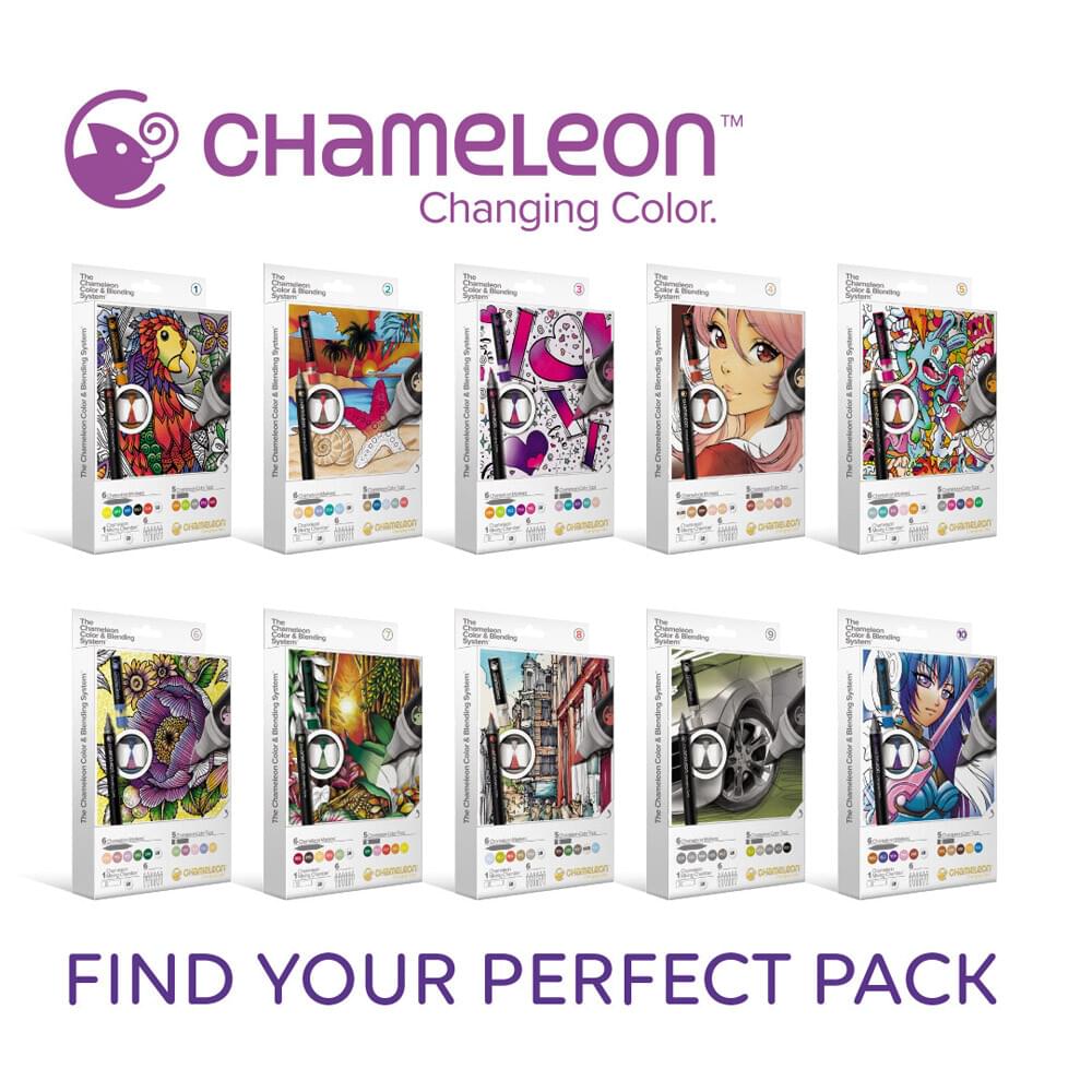 The Chameleon Color & Blending System gives artists colour blending options like never before. The patented system allows you to colour from light to dark, dark to light and colour to colour; giving endless colour blending possibilities. These sets combine Chameleon’s multi-award winning Chameleon Markers with the new Chameleon Color Tops.