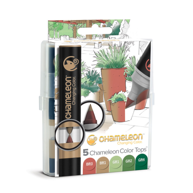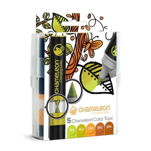 *CHAMELEON NATURE COLOR TOPS Set of 5. Nature Tone set includes the colours :BR1 Taupe, BR3 Cinnamon, GR1 Green Apple, GR2 Dark Sage, GR4 Evergreen. |