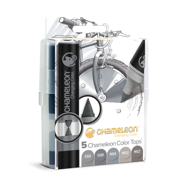 *CHAMELEON GRAY COLOR TOPS Set of 5. Gray Tone set includes the colours :CG5 Cool Gray 5, CG9 Cool Gray 9, NG4 Neutral Gray 4, WG3 Warm Gray 3, WG7 Warm Gray 7. |