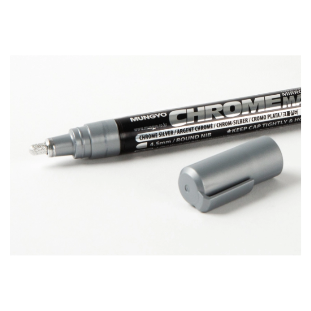 MUNGYO METALLIC CHROME MARKER - SILVER. The 4.5mm wide bullet tip produces lines 2-3mm wide and once dry the ink becomes permanent and waterproof. Supplied in hang-sell packaging. |