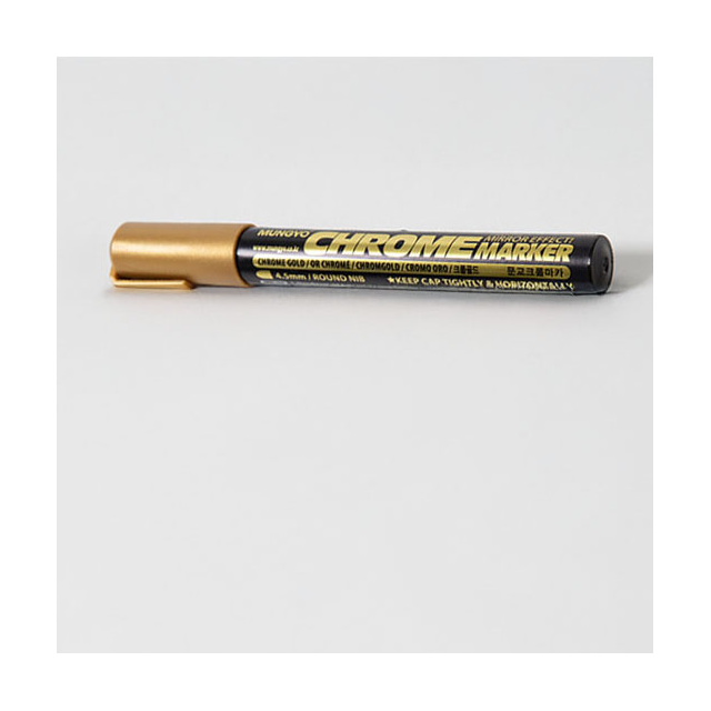 MUNGYO METALLIC CHROME MARKER - GOLD. The 4.5mm wide bullet tip produces lines 2-3mm wide and once dry the ink becomes permanent and waterproof. Supplied in hang-sell packaging. |